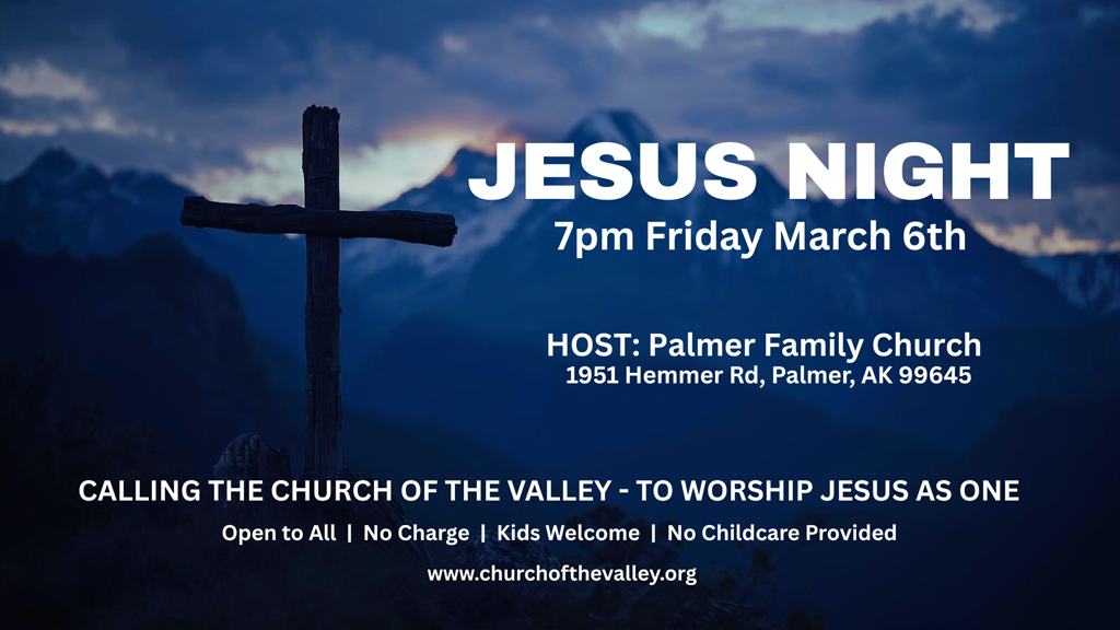 The Lord is building the WHOLE HOUSE into a temple in which He can dwell (Eph 2:19-21). The Church of The Valley is saying YES to what The Lord is doing and something special is happening. Jesus Nights happen every first Friday of each month where we gather, as one, to worship Jesus and declare His Lordship over our lives, this valley, and His Church. Join us for the next Jesus Night and break bread together at the table of The Lord.